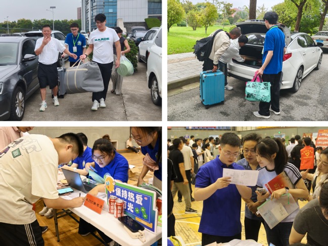 晨光微露,细雨氤氲。学生志愿者们早已守候在各处,为新生提供引导咨询、行李搬运、手续协办等一站式服务。他们不仅热情相助,还主动介绍校园生活、分享学习经验,帮助学弟学妹更快融入环境。