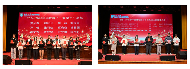 大会对各类优秀学生进行集中表彰,涵盖“省赛二等及以上奖项”“校级优秀学生干部”“校级三好学生”“新生军训先进个人”等多项荣誉。主席台领导老师为获奖学生颁奖,现场气氛热烈。表彰既是对过往成绩的肯定,也激励全体同学接续奋斗、再创佳绩。