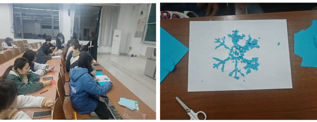 同学们以手撕蓝纸,拼贴出千姿百态的雪花。于专注创作中,冬日童话跃然指尖,片片雪花皆化为情感与想象的载体。耐心与审美交融,令作品生动而映照内心;完成时的喜悦与成就感,更为冬日注入暖意,点亮心灵。纸艺雪花不仅定格了冬日的浪漫,更铭刻下成长的印记。
