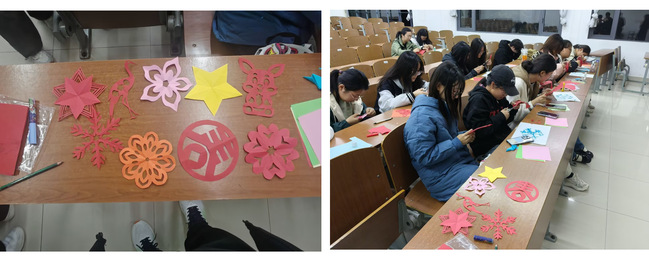 同学们执剪创作,以雪花、玉兔、梅花等意象传递吉祥丰收的祝愿。运剪如笔,心手相应,在专注间滤尽喧嚣,唯存纯粹。雪花之皎洁、玉兔之灵动、梅花之坚韧,皆寄托着对生活的美好向往。每一剪皆是祈愿,每一纸都映照憧憬。剪纸不仅传承技艺与祝福,更唤起心灵与传统的共鸣。