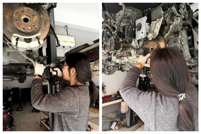 在江苏省徐州市睢宁县高作前进汽车养护中心,241学生蔡晓晓协助维修师傅开展车辆维修实践。她参与接车登记、基础检测、发动机保养等环节,协助拆解检修零部件,记录故障数据与维修流程,并向车主普及车辆保养与冬季行车安全知识,在实践中感受工匠精神,彰显青年担当。