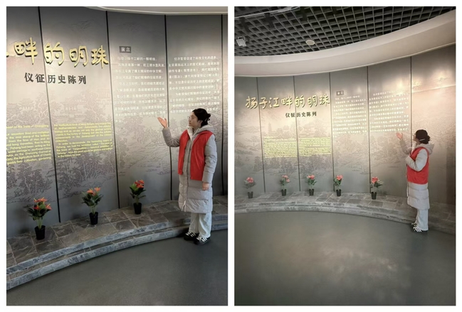 在仪征历史博物馆,254班学生张雅文协助博物馆工作人员开展讲解引导与文物科普工作。她参与逐一对接参观团体,关注对历史文化感兴趣的青少年群体,通过现场讲解协助梳理文物脉络,为博物馆知识传播提供助力。同时,她向游客普及仪征的历史沿革、非遗传承、文物保护等知识,在与观众交流中加深了对文博工作的理解,感受到讲解员传递文化温度的责任。