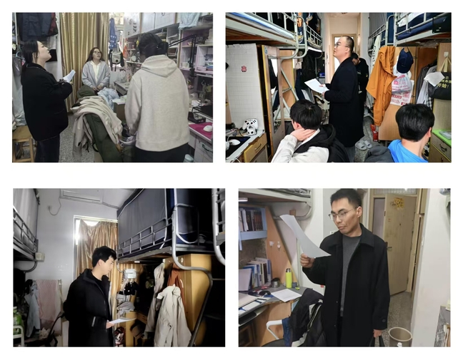 在排查安全隐患之余,老师们还与走访宿舍同学深入交流,详细了解同学们的日常作息、宿舍卫生及寝室相处氛围。通过面对面的交流,师生共同关注是否存在熬夜打游戏、室内吸烟等不良生活习惯,以及室友间是否相互包容、和谐共处。针对走访中发现的具体问题,老师们耐心提出改进建议,学生干部则从朋辈角度分享自律经验,引导同学们摒弃陋习、珍惜集体生活环境,共同营造安全有序、健康文明、温馨和谐的宿舍家园。
