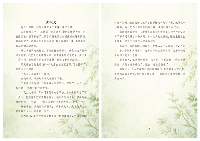 《那束光》落笔于青春求学心路,细腻描摹学业低谷里班主任王老师温暖治愈的育人日常。文章定格失意深夜的温柔开导、针对性学业帮扶、日复一日耐心陪伴等暖心碎片,以师生相伴的细碎故事,诉说师者润物无声的守护力量,诠释师恩照亮迷茫青春、托举少年重拾自信、奔赴成长前路的温暖内核,藏着少年被温柔守护、于黑暗中重拾光亮的向阳蜕变。