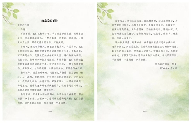 《致亲爱的王帅》是一篇饱含深情的青春友谊书信。文章以时光为轴,追忆初高中同窗相伴的温暖过往,珍藏失意时互相治愈、并肩奔赴前路的青春点滴,感念挚友沉稳通透、自带光芒的珍贵特质,道尽跨越距离、初心不改的长久羁绊。全篇满含青春同行的珍贵与久伴不散的真挚,诠释历久弥新的知己情谊,尽显少年情谊的纯粹美好。