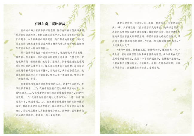 《有风自南,翼比新苗》以地理课堂为叙事底色,勾勒两位亦师亦友的良师形象。文章细数高中地理老师以板书之真、授课之热,四季相伴引领学生窥见喀斯特、丹霞等天地奇景;描摹大学老师以亲和之态、通俗之讲,将知识与生活见闻相融。全篇以“亦师亦友,亦暖亦光”为落点,串联成长路上师者的温柔托举,诠释良师以专业启蒙、以陪伴温暖,助力学子在知识天地里拔节生长的教育真谛。