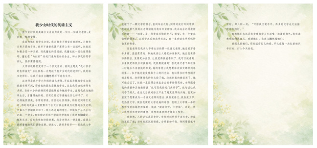 《我少女时代的英雄主义》以青春心路为叙事脉络,深情回望少女时代给予自己精神引领的语文女老师们。文章聚焦汪老师的优雅风范与文学启蒙,以赠言种下文学种子;描摹袁老师的温柔包容与坚定鼓励,发掘学生闪光点,助力重拾自信。全篇以“英雄主义”为引,讲述女教师们温润长久的陪伴,诠释师恩如何驱散少女自卑、点亮理想微光,终成学子前行路上的精神底气与成长力量。
